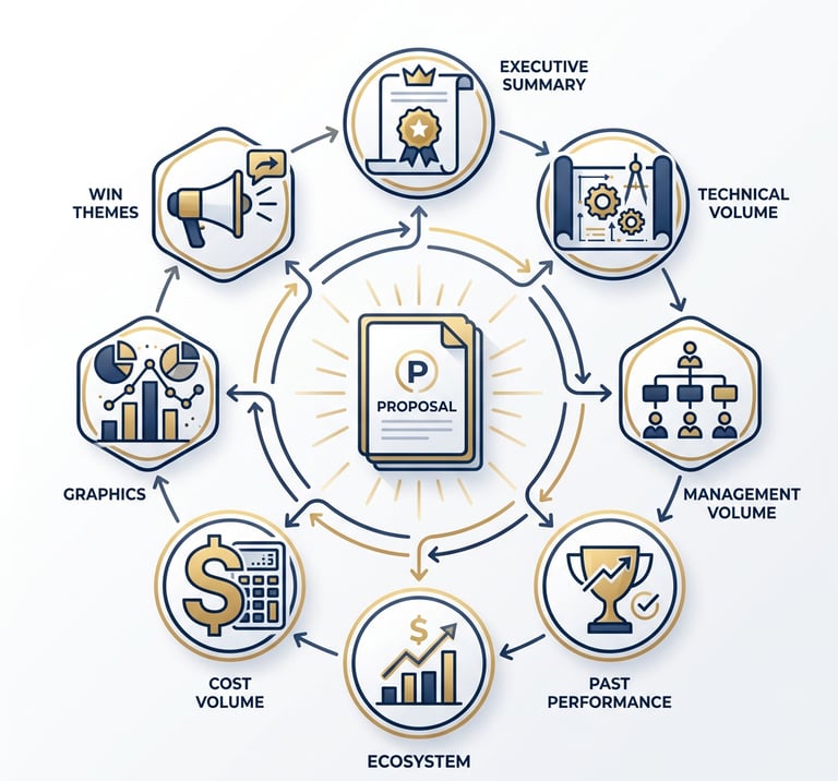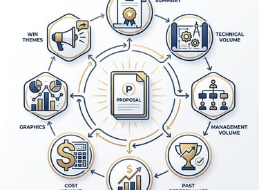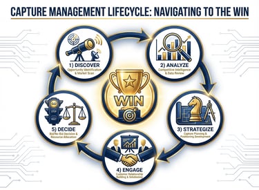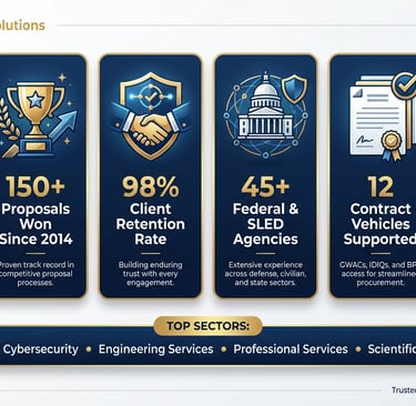 Winning federal contracts demands more than a great technical solution—it requires strategic positioning long before the RFP drops and flawless execution once it's released. We help you identify the right opportunities, understand who you're competing against, and build relationships with decision-makers who matter. Our capture specialists work alongside your team to develop winning strategies, secure the right teaming partners, and make confident bid decisions backed by data. When the RFP arrives, our PMP-certified proposal managers take the lead—analyzing requirements, coordinating your team, crafting compelling narratives that showcase your strengths, and putting your proposal through rigorous color team reviews that simulate government evaluation. We don't just help you respond to RFPs; we optimize every section for maximum scores, ensure 100% compliance, and deliver on time. From opportunity discovery through debriefing analysis, we bring 70+ years of combined leadership experience and a proven track record of multi-million dollar wins across Healthcare, IT, and Engineering sectors. Whether you need full-service support or targeted expertise for a critical phase, we're your strategic partner for winning